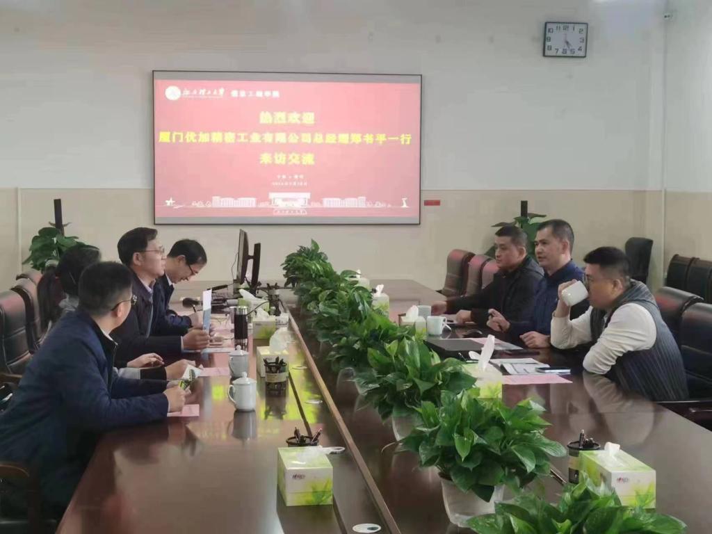 本网讯(曾谙艺 罗嘉妮)2月28日下午,我校校友、厦门优加精密工业有限公司总经理、执行董事郑书平一行来我校信息工程学院九章楼303会议室洽谈校企合作相关事宜。信息工程学院党委书记刘晓军、院长杨书新、人工智能教研室主任易见兵、机电工程学院智能制造党支部书记刘赣华等人参加座谈交流。