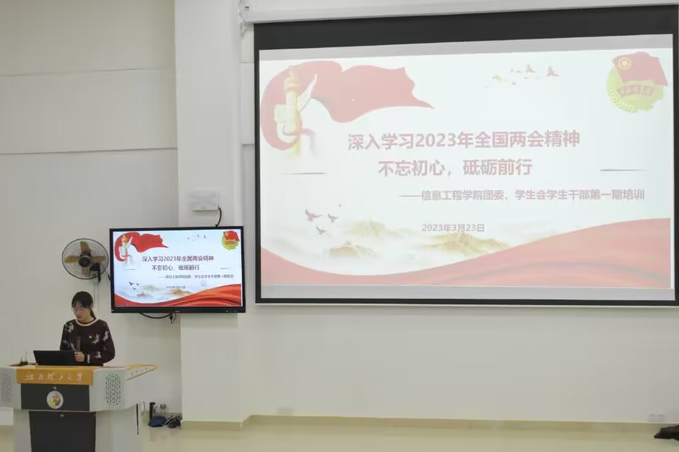 本网讯(郭伟利 聂俊涛)为深入学习贯彻落实全国“两会”精神,强化理论武装与理论引导,引领团学骨干深刻领会、准确把握“两会”精神实质,更好团结引领广大团员青年永远跟党奋进新征程。3月23日晚,信息工程学院团委于阅道楼508开展以“不忘初心,砥砺前行”为主题的团委、学生会学生干部培训。此次培训会议由信息工程学院辅导员蒋越老师主讲,全体团委、学生会学生成员参与此次会议。
