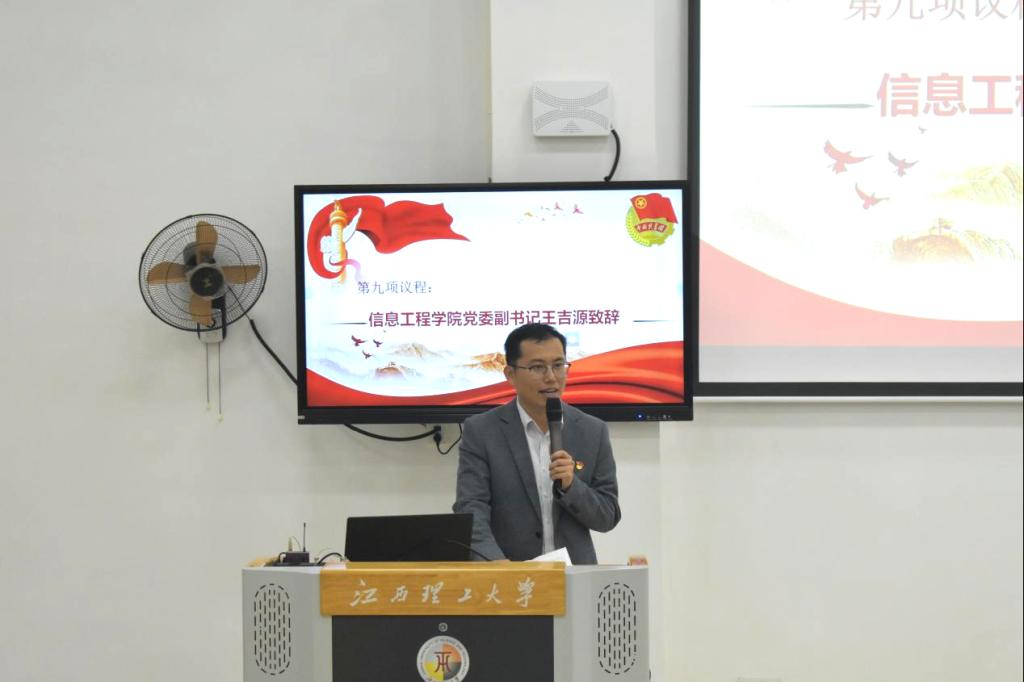 学院党委副书记王吉源为大会致辞。他代表学院党委高度赞扬了第二十一届团委、学生会取得的成绩以及院学生骨干在学校疫情防控大局中展现出的勇于担当、甘于奉献的青春力量。对新一届当选的学生干部表示热烈祝贺,向辛勤工作、真心付出的上一届团委、学生会的学生干部表示衷心的感谢。并对各位新一届学生干部提出希望:一是把握正确政治方向,小我融入大我,团结引领广大同学紧密团结在党的周围,奔跑在实现民族复兴的赛道上。二是坚持服务同学宗旨,小众服务大众,做好学校与学生之间信息互达桥梁、情感沟通纽带。三是持续深化学生会改革,建设服务型、学习型、创新型团委、学生会。他殷切寄语同学们要用心用情当好学校、学院与学生的纽带,为同学发声、为学校建言,希望全体信息学子在认真学习宣传贯彻党的二十大精神之际,坚定理想信念,让青春在全面建设社会主义现代化国家新征程上绽放绚丽之花。