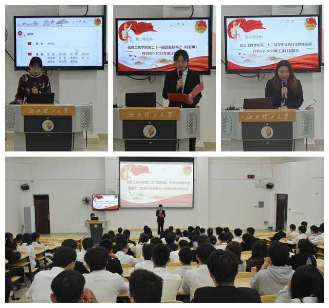 紧接着,党委副书记王吉源为第二十一届团委、学生会优秀部门颁发荣誉证书,副院长许春冬为第二十一届团委、学生会优秀学生干部颁发荣誉证书,辅导员蒋越为第二十一届团委、学生会学生干部颁发聘书并宣读第二十二届团委、学生会成员名单。随后,信息工程学院第二十二届学生会执行主席陈安丹作2022-2023学年工作计划报告,她表示在未来的一年中,信息工程学院团委、学生会将继续战胜各种困难,精心打造学院品牌活动,打造和谐学生文化氛围,加强团委、学生会自身建设,进一步充实团委、学生会自身文化建设,加强学生干部团队建设,打造和谐团委、学生会,更好地为学生服务。