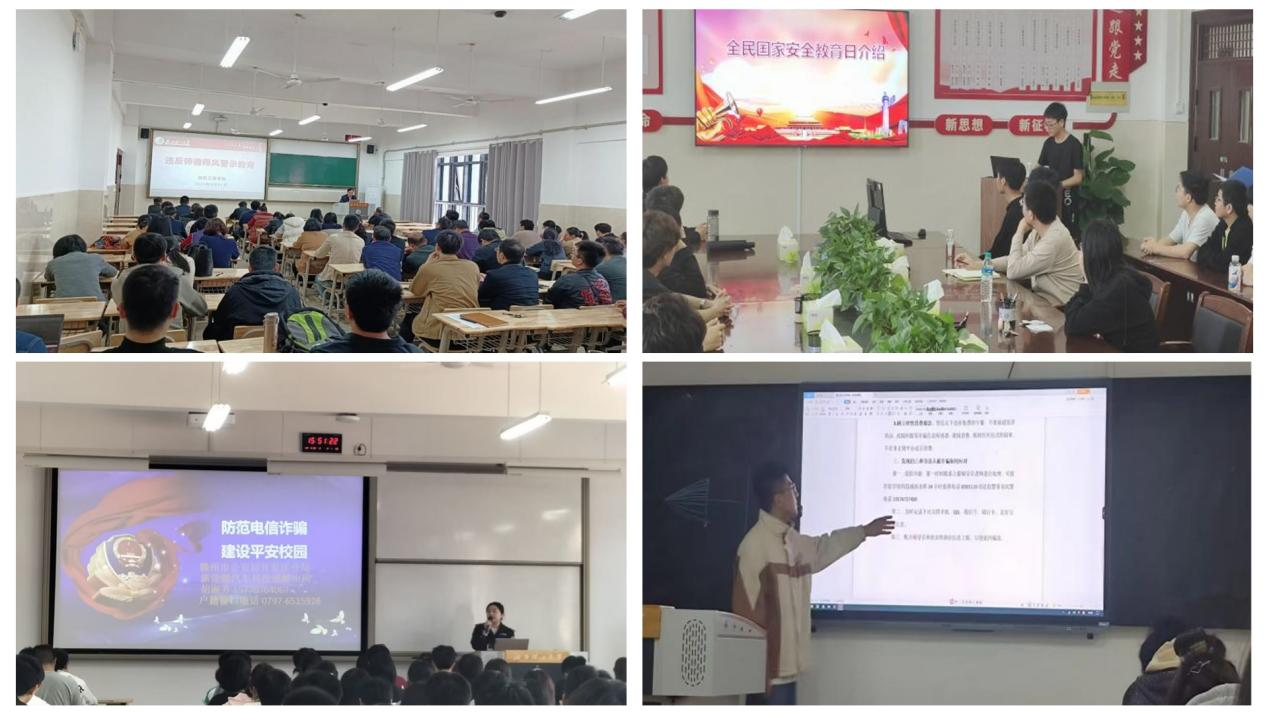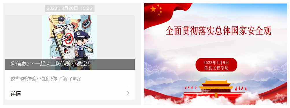 学院党委高度重视此次国家安全教育日活动,自上而下,统一部署,以专题会议就2023年国家安全教育日工作开展了部署安排,层层抓好落实;开展教职工警示教育大会,以典型警示案例教育全体教职工,推动全体教职工严守党规党纪和法律法规,系好廉洁“安全带”,强化政治安全,严守网络安全;分年级组织开展防范网络诈骗主题教育大会,加强学生的安全教育宣传,提升学生反诈意识,提升反诈骗能力;联合属地民警开展以“防范电信诈骗,建设平安校园”为主题的反诈宣传讲座,共筑警校反诈安全网;统一讲稿、统一行动,制定并下发了《信息工程学院2023年全民国家安全教育日宣讲稿》,全覆盖面向班级学生进行宣传教育。通过一系列宣传教育活动,进一步提升师生国家安全意识和素养,进一步筑牢国家安全的人民防线。
