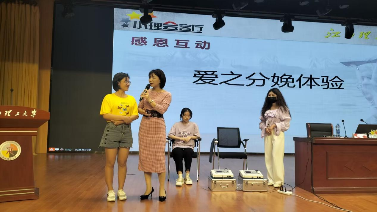 此外,讲座现场还开展了“爱之分娩体验”活动,同学们自发上台亲身体验母亲分娩时的阵痛。受邀学生中有的在中途喊停,表示疼痛难忍,也有坚持到最后,完整体验了母亲分娩的痛苦。其中,大二学生李静在体验完后发表了自己的感悟:“此次讲座是学校送出的最好的‘母亲节’礼物,把健康知识和技能带回家,带给自己和母亲,尤其是体验母亲分娩的疼痛,让我切身领会到母亲的不容易,以后会加倍感恩母亲,多体谅她?!苯沧詈?,卢瑞英还呼吁同学们在平时多与母亲联系,用自己的实际行动表达对母亲的反哺之恩和感恩之情。