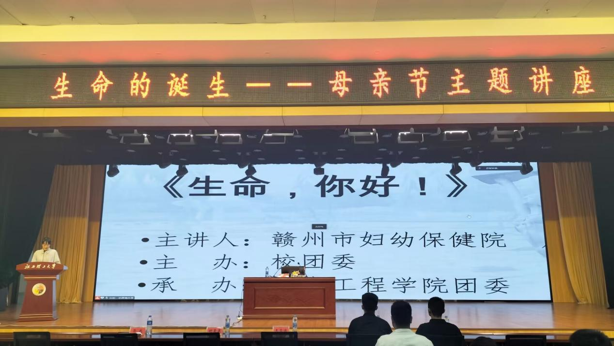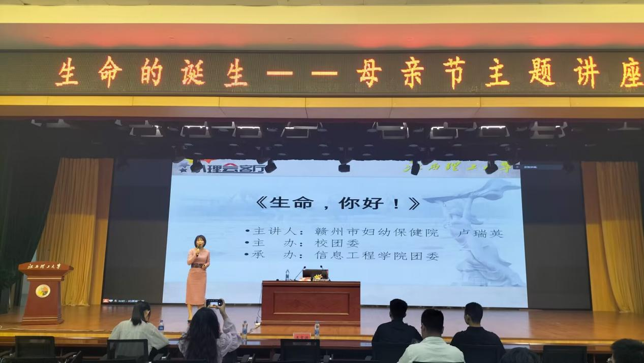 本网讯(吴敏)五月康乃馨,爱心献母亲。在母亲节到来之际,为培养广大学子知恩、感恩、报恩的优秀传统美德,增强社会责任感,培养健康心态,塑造健全人格,5月10日,由校团委主办、信息工程学院团委承办的“生命的诞生”母亲节主题讲座,在三江校区三实楼一楼多功能厅举办。本次讲座特邀赣州市妇幼保健院副主任护师卢瑞英担任主讲人,全校200余名师生到场聆听讲座。