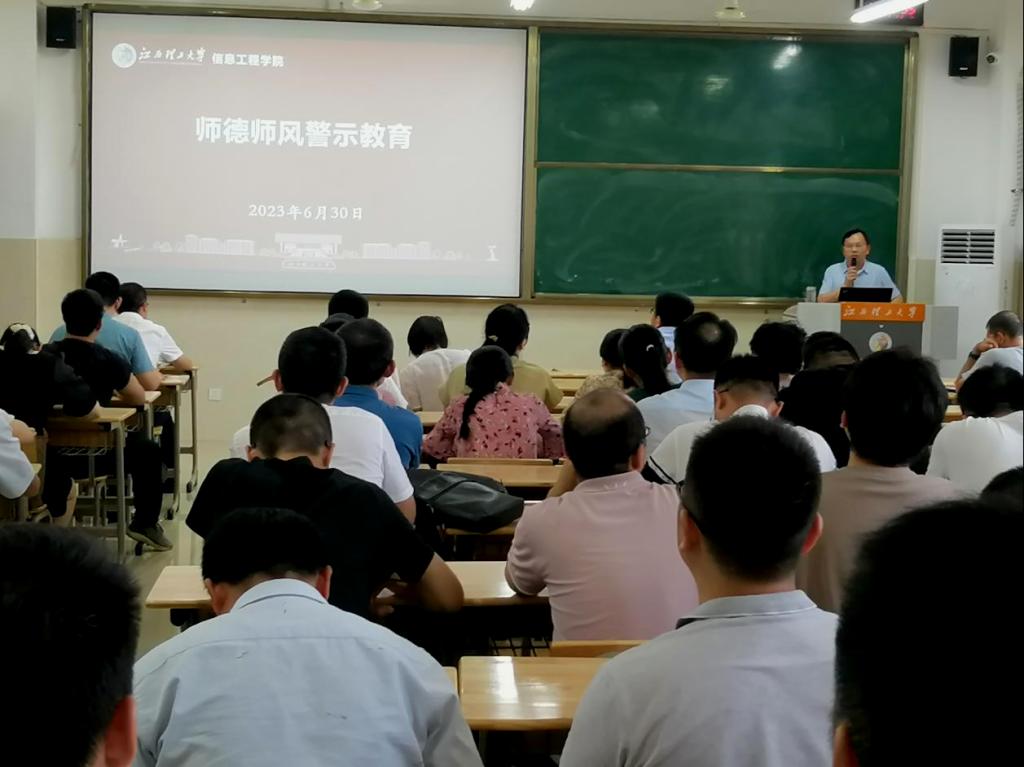 为深入学习贯彻习近平新时代中国特色社会主义思想,学习贯彻习近平总书记关于教育的重要论述和重要指示批示精神,进一步加强师德师风建设,提升教师的思想政治素质和职业道德水平,落实“师德师风作为评价教师队伍素质的第一标准”要求,引导广大教职工弘扬优良师德师风,6月30日下午,我院在九章楼402教室召开师德师风警示教育大会,全体教职工参会,会议由学院党委书记刘晓军主持。