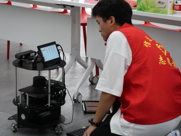 随后实践队员艾振欣向企业演示其所在大学生创新团队的科技创新作品——智慧养老服务机器人。该机器人通过输入端进行远程控制,实现了视觉跟随、地图构建、自助导航、多点导航、语音交互、图像识别与提示等实用性功能。在与企业技术人员交流的过程中,企业技术代表对实践队带来的科技作品给予了高度肯定,同时也就其技术难点提出了改进建议,希望艾同学可以继续将所学理论运用到实际,优化完善现有功能,用所学服务行业、服务社会。艾振欣同学也受到很大启发,在最后和大家分享了自己今后的研发规划,希望能够通过后续研发实现更加精准、高效、实用的功能型机器人。