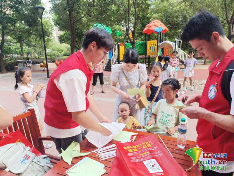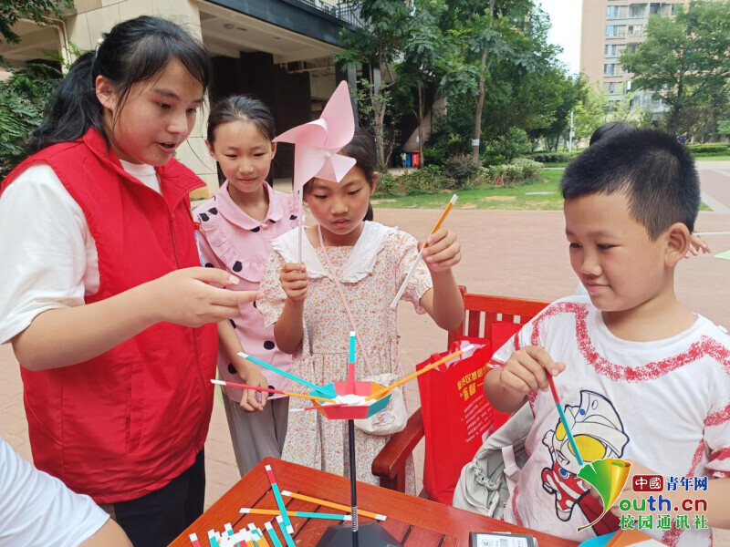 图为实践队员教小朋友折风车。 中国青年网通讯员 徐泓菲 摄