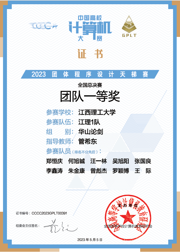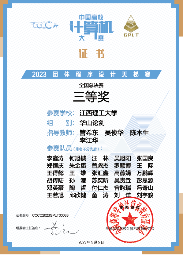 中国高校计算机大赛-团体程序设计天梯赛是由教育部高等学校计算机类专业教学指导委员会、教育部高等学校软件工程专业教学指导委员会、教育部高等学校大学计算机课程教学指导委员会及全国高等学校计算机教育研究会共同发起的一项赛事。来自北京大学、浙江大学、电子科技大学、吉林大学、武汉大学、华中科技大学、东北大学、北京邮电大学等来自全国31个省市自治区的430所高校组成的1624支队伍16167位参赛学生参加了三个小时的激烈角逐。比赛全过程由计算机自动测评,最终评判出全国高校一等奖17项、二等奖25项、三等奖38项;团队一等奖84项、二等奖164项、三等奖244项。我校派出5支队伍参加了本次比赛,最终荣获全国团队一等奖1项,三等奖2项,并在华山论剑组第31名荣获高校三等奖,省内只有南昌航空大学、江西师范大学和江西理工大学获得高校奖。其中我?!敖?队”和南昌航空大学的“梦想照进现实1_昌航软件2023”总分并列全省第一。