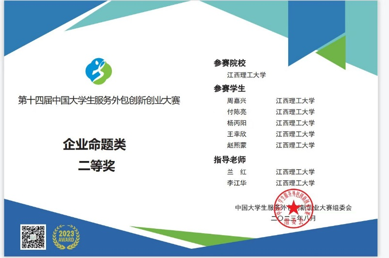 “中国大学生服务外包创新创业大赛”作为服务外包产业领域唯一的国家级赛事,每年吸引1600余所高校、近50余万名大学生参加,包括南京大学、上海交通大学、西安交通大学、哈尔滨工业大学等双一流高校,总计8006支团队报名参赛。我院计算机科学与技术专业学生经过区域选拔赛、东部赛区现场赛、全国总决赛等层层竞赛比拼,最终荣获全国A类二等奖1项、三等奖1项、省级三等奖3项的好成绩,同时也是江西省参赛高校中唯一的A类二等奖。