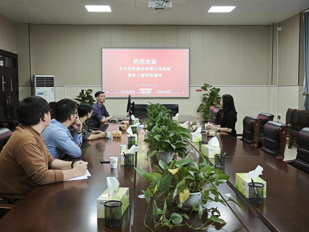 为深化校企合作,拓展办学资源,促进毕业生高质量就业,10月25日下午3点,信息工程学院与永中软件股份有限公司在九章楼303室召开了校企合作座谈交流会。信息工程学院副院长李伟,计算机科学与技术教研室主任欧阳城添、计算机党支部书记李江华、就业辅导员申黎等相关教师与永中软件大客户二部总经理杨洁琼进行座谈交流。