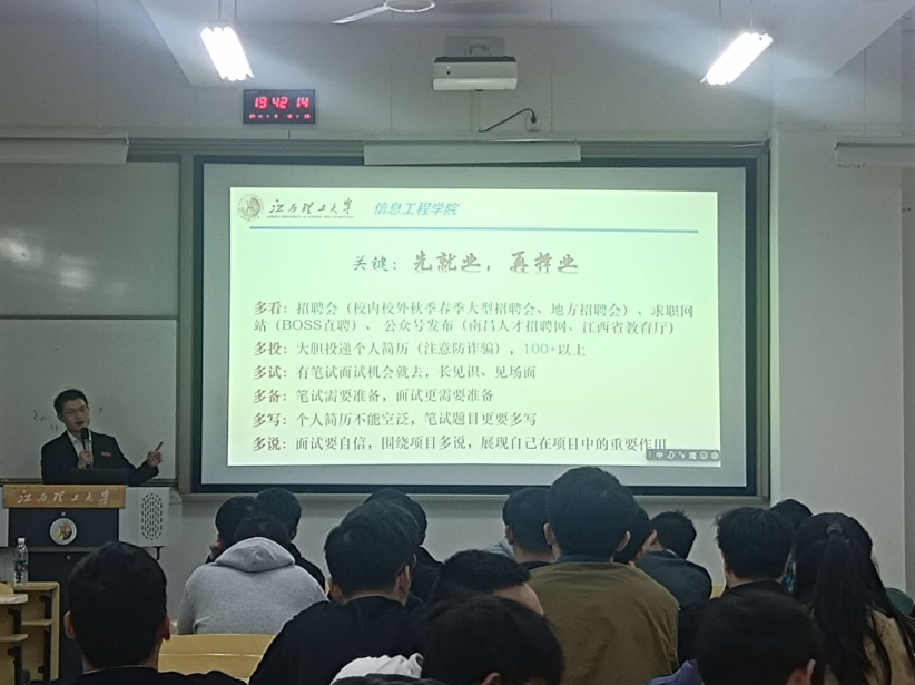 此外,由就职于江西理工大学党委办公室、校长办公室科员的黄红武分享他成功择业的心得,他强调,就业最关键的是:先就业再择业,大家一定要牢记“六个多”:多看、多投、多试、多备、多写、多说。