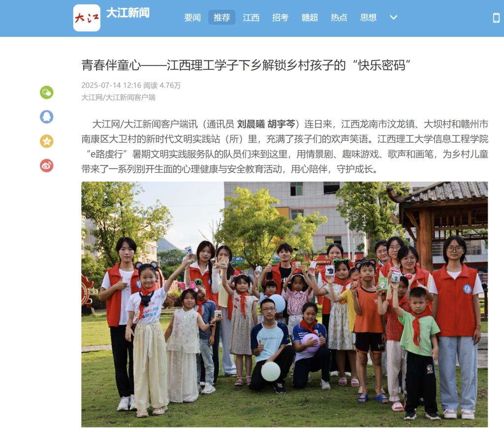 7月5日至9日,江西龙南市汶龙镇、大坝村和赣州市南康区大卫村的新时代文明实践站(所)里,充满了孩子们的欢声笑语。江西理工大学信息工程学院“e路虔行”暑期文明实践服务队的队员们来到这里,用情景剧、趣味游戏、歌声和画笔,为乡村儿童带来了一系列别开生面的心理健康与安全教育活动,用心陪伴,守护成长。
