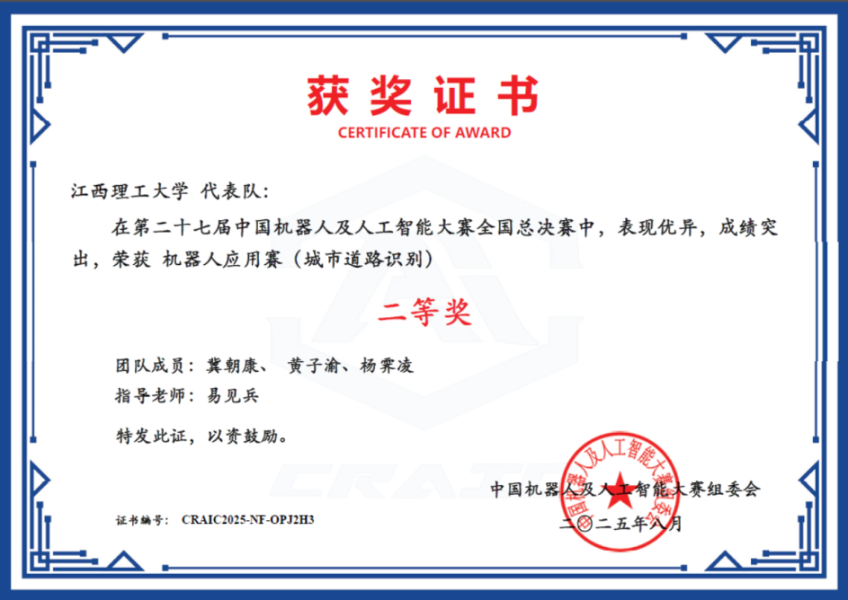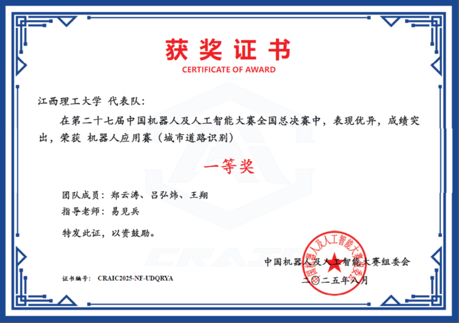 近日,第二十七届中国机器人及人工智能大赛全国总决赛获奖结果公布。由信息工程学院易见兵、彭鑫老师指导的参赛队伍不畏挑战、奋力拼搏,最终在机器人应用赛(城市道路识别)中,人智221班郑云涛等同学获得全国一等奖1项、人智221班冀朝康等同学获得全国二等奖1项、人智231班刘鑫等同学获得全国三等奖1项。