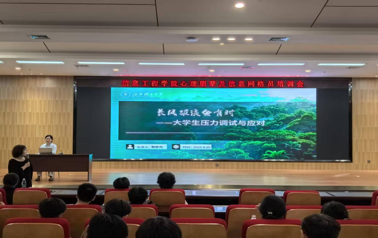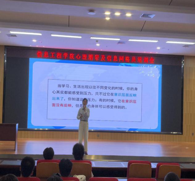 为深入学习贯彻全国高校思想政治工作会议及全国教育大会精神,落实立德树人根本任务,助力学生健全人格、提升心理素质,9月25日19:00,由信息工程学院团委、学生会主办的“大学生心理压力调试与应对”朋辈心理技能培训讲座在图书馆报告厅如期举行。本次讲座由校心理健康教育中心主任郭修凤主讲,信息工程学院全体本科生、研究生班级班长、团支书、心理委员,学院学生会心理部全体成员及各宿舍寝室长到场参与。讲座以“长风破浪会有时”为核心主题,围绕大学生常见心理压力展开系统讲解。