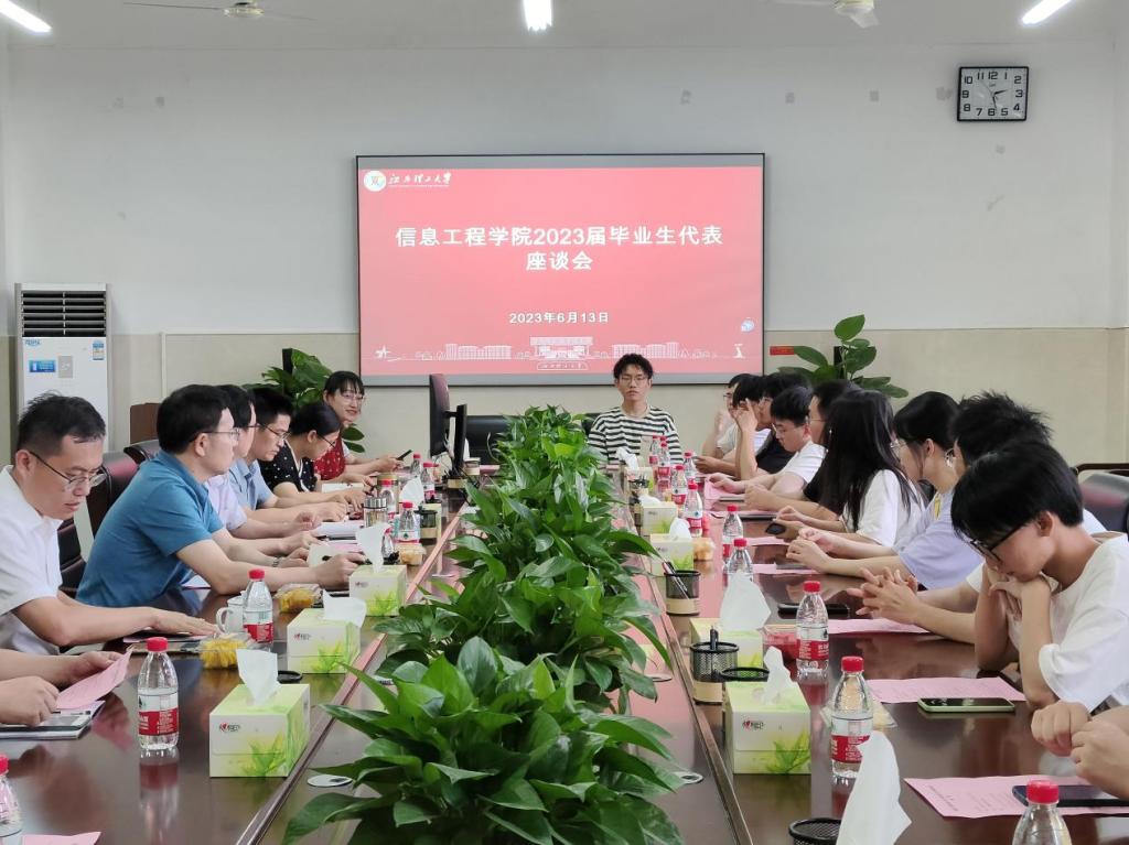 本网讯(曾令珍)时间匆匆,光阴荏苒,转眼又到一年毕业季。为欢送毕业生顺利毕业,以及从学生角度了解对学院人才培养工作的看法和存在的问题,6月13日下午,信息工程学院在九章楼303会议室召开2023届毕业生代表座谈会,信息工程党委书记刘晓军、院长杨书新、副书记王吉源、副院长许春冬,各教研室主任以及全体毕业班辅导员出席会议,各毕业班学生代表参加会议。